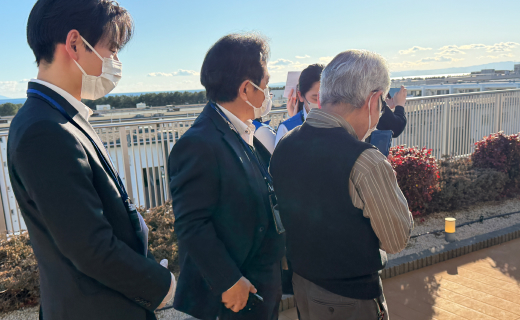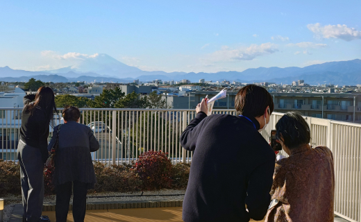 教室の後半では、学んだ知識を即座に実践するため、施設の屋上へと移動し撮影会を実施しました。当日は快晴に恵まれ、遠くに雪を冠した見事な富士山を望むことができました。