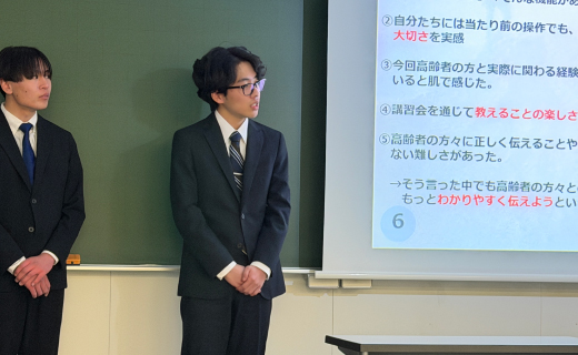 2025年12月の中間報告会では、実際にスマホ教室を開催する施設と「スマホをきっかけに生活に彩りを添え、他者との交流を深めてもらいたい」という思いから、テーマは「写真・コミュニケーション」に決定しました。より質の高いコンテンツへとブラッシュアップするため、学生たちは当社が東京都豊島区と連携して実施している「区民ひろば×ソフマップスマホ教室」を実際に見学。現地で当社講師の教え方などを学び、受講者のサポートを体験しました。